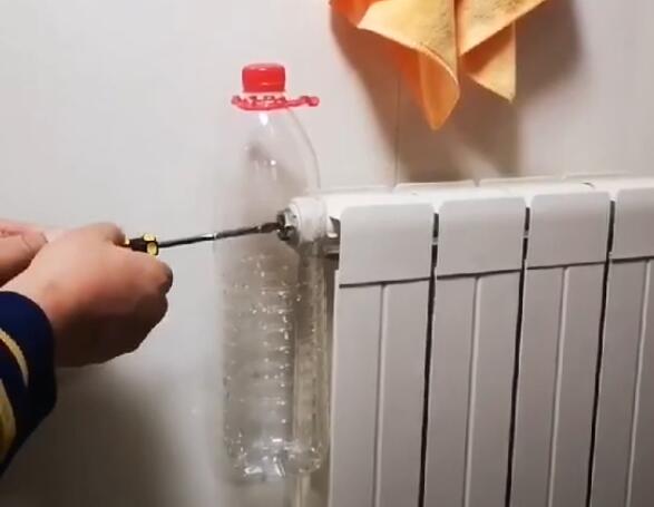 4、把打好洞的礦泉水瓶子洞口和暖氣閥一樣大的那邊固定在暖氣片閥門(mén)上,另一邊使用匹配的螺絲刀輕輕擰松放氣閥,聽(tīng)到有氣體排出的聲音后停止扭動(dòng)。這里提醒,排氣閥比較小,在擰開(kāi)的時(shí)候一定要小心操作,避免掉落丟失。