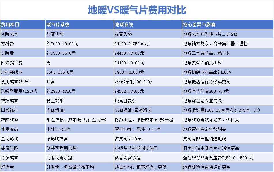 初裝成本結(jié)論:在120平米的住宅中,暖氣片系統(tǒng)的初裝成本顯著低于地暖系統(tǒng),通常只有地暖的50%-60%甚至更低。地暖高昂的投入主要源于更復(fù)雜的材料構(gòu)成、精細(xì)的安裝工藝以及必不可少的回填找平工程。